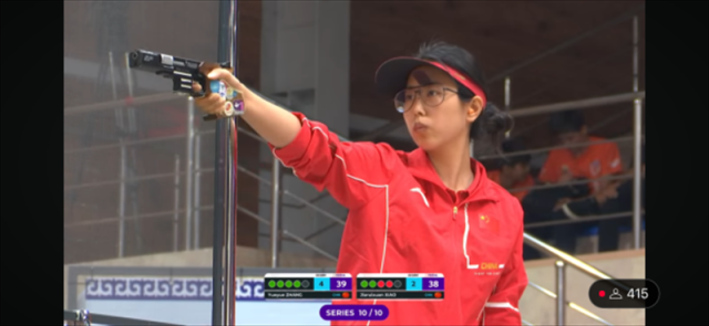 决赛场可谓高手云集,包含了巴黎奥运会该项目冠军、韩国选手梁智仁,东京奥运会该项目季军肖嘉芮萱,该项目现世界排名第二、印度选手玛努·巴克尔。张悦悦在决赛第一组射击只打出了1中,排在8名参赛选手的最后一位。此后她迅速调整,在第2、3、4组射击打出了全中,实时排名跃居并列第一,和肖嘉芮萱同积16中。之后两名中国选手一直占据前两位,争夺最后的金牌归属。第5组射击张悦悦打出4中,肖嘉芮萱只有3中,前者独占头名。接下来一组射击,张悦悦将领先优势扩大到2中,不过肖嘉芮萱在第8组打出全中,反超张悦悦1中。第9组射击,两人都打出全中,肖嘉芮萱仍居第一。进入最后一组射击,张悦悦打出4中,肖嘉芮萱打出3中,二人同积39中进入加枪对决。在加枪对决中,张悦悦把握住了机会,以4中比3中战胜肖嘉芮萱,将这枚金牌收入囊中。